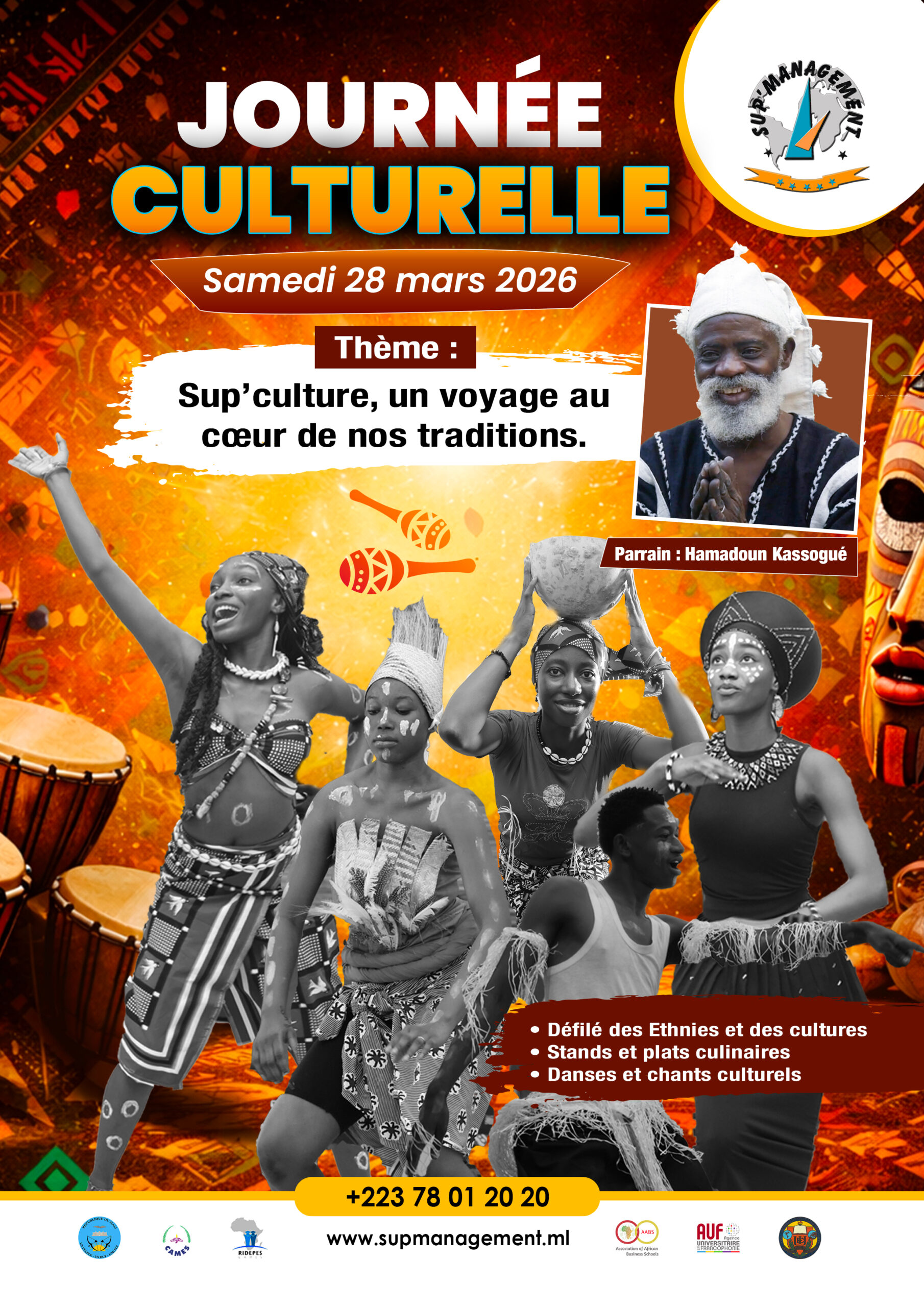 JOURNÉE CULTURELLE 2026 Le samedi 28 mars 2026, un seul lieu, une seule scène… mais des dizaines d’ethnies, plusieurs nations, une infinité d’histoires.À Sup’Management, les frontières disparaissent pour laisser place à l’essentiel :nos origines, nos identités, notre fierté.Du Mali au reste du monde, chaque communauté apporte son âme,chaque tenue raconte une histoire,chaque pas de danse fait vibrer une mémoire.